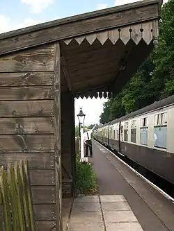 The railway was operated from the start by the Bristol and Exeter Railway, which became a part of the Great Western Railway (GWR) in 1876;[1] but the West Somerset Railway remained an independent company until 1922, when it too was absorbed by the GWR. The platform was extended northwards in 1900 and again in 1933; a small signal box was in use here for a few years but was closed on 6 April 1926.[2] The GWR undertook many projects to increase the capacity of the line in the 1930s. Because of the position of the goods shed opposite the platform it was not possible to add a second track and platform at Stogumber, so a passing loop was instead constructed at Leigh Bridge just 0.75 miles (1.21 km) south of the station. It was opened on 16 July 1933 but the signal box was generally only used during the daytime each summer.[3] A GWR camping coach was placed in the goods yard from 1934 to 1939.[4][5] A camping coach was also positioned here by the Western Region of British Railways from 1952 to 1964,; the lack of facilities at this remote location meant that this was accompanied by a water tanker and stores van.[6]