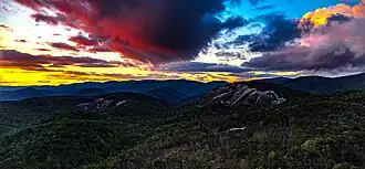 Stone Mountain is the centerpiece of Stone Mountain State Park in North Carolina. It is a dome of exposed granite (specifically a quartz diorite to granodiorite) of Devonian age, which has intruded into the gneiss of the Precambrian Alligator Back Formation.[1] It rises sharply over 600 feet (183 m) above the surrounding terrain. The mountain, which has an elevation of 2,305 feet (706 m) above sea level, is known for its barren sides and distinctive brown-gray color, and can be seen for miles. The mountain offers some of the best rock climbing in North Carolina, and the park's creeks and streams feature excellent brook trout fishing.