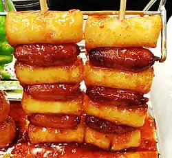 Tteok-kkochi A street food consisting of skewered and fried tteok (rice cakes) brushed with spicy gochujang-based sauce.