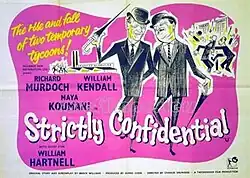 Strictly Confidential is a 1959 British second feature ('B')[1] comedy film directed by Charles Saunders and starring Richard Murdoch, William Kendall, Maya Koumani and Neil Hallett.[2] The screenplay was by Brock Williams. Two con-men, recently released from prison, are enlisted by a widow to help her recover control of her late husband's business.