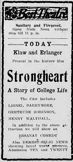 Strongheart is a 1914 American silent Western black and white film directed by James Kirkwood Sr., produced by Henry B. Harris, written by Frank E. Woods and starring Henry B. Walthall, Lionel Barrymore, Blanche Sweet and Antonio Moreno.[1] The film was supervised by D.W. Griffith.[2]