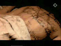 Image of a woman's body with Koranic verses written on it from the film Submission. The actress plays the role of a Muslim woman (dressed with a transparent black clothing), having been beaten and raped by a relative. The bodies are used in the film as a canvas for verses from the Quran.[1]