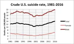 In 2015, suicide was the seventh leading cause of death for males and the 14th leading cause of death for females.[20] It was the second leading cause of death for young people aged 10 to 34.[21] From 1999 to 2010, the suicide rate among Americans aged 35 to 64 increased nearly 30 percent. The largest increases were among women aged 60 to 64, with rates rising 60 percent, then men in their fifties, with rates rising nearly 50 percent.[22] In 2008, it was observed that U.S. suicide rates, particularly among middle-aged white women, had increased, although the causes were unclear.[23] As of 2018, about 1.7 percent of all deaths were suicides.[2]