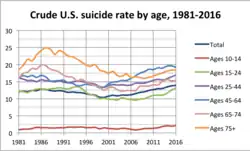 Crude suicide rate in the United States by age, 1981–2016[32]
