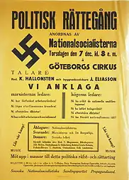 Swedish National Socialist Unity Party poster, announcing a public meeting in Gothenburg. The meeting was titled 'Political Trial', in which the party would present accusations against the Marxist and Right-wing leaders. The main speakers of the event was K. Hallonsten and J. Eliasson.
