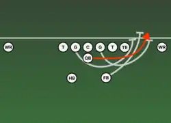 The quarterback sweep is a running play where the quarterback takes the snap from center, typically in a shotgun formation, and then runs to the outside. This play can best be run by a fast, athletic quarterback. Sweeps often involve pulling of offensive linemen, usually one or both guards, to provide extra blockers at the point of attack.[8] Teams such as the Arkansas Razorbacks have had success running this play by lining up the halfback as the quarterback in a wildcat formation.