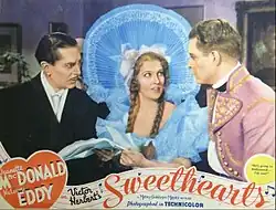 Sweethearts is a 1938 American Technicolor musical romance film directed by W.S. Van Dyke and starring Jeanette MacDonald and Nelson Eddy. The screenplay, by Dorothy Parker and Alan Campbell, uses the “play within a play” device: a Broadway production of the 1913 Victor Herbert operetta is the setting for another pair of sweethearts, the stars of the show. It was the first color film for Nelson or Jeanette (as well as MGM's first three strip Technicolor feature).[5] It was their first film together without uniforms or period costumes.[6]
