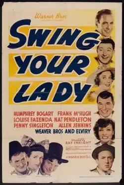 Swing Your Lady is a 1938 American country musical comedy film directed by Ray Enright, starring Humphrey Bogart, Frank McHugh, and Louise Fazenda. Ronald Reagan is also in the cast in one of his early roles. Brunette singer Penny Singleton who was also cast was about to turn blonde and embark on a long, hugely successful career playing the iconic comic strip character Blondie in a series of 28 films and a popular radio show.