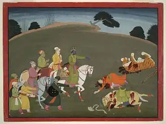 Satrajita later presented the gem to Prasena, his brother, who was also the ruler of a Yadava province. Prasena wore it often, until once while hunting in the forest while wearing it, he was attacked by a lion, which killed him and fled with the jewel. But it could not get away with it, for shortly after, it was attacked by Jambavan, described as the king of the bears, who killed it after a fierce fight and took off with the bounty. Jambavan was loyal to Rama, and was considered one of the seven immortals, or the Chiranjivi.[8]