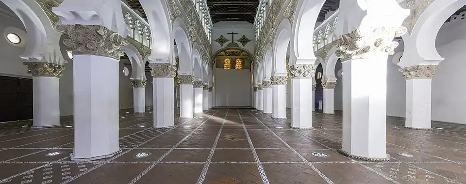 The synagogue is a Mudéjar construction, created by Moorish architects for non-Islamic purposes. But it can also be considered one of the finest example of Almohad architecture because of its construction elements and style. The plain white interior walls as well as the use of brick and of pillars instead of columns are characteristics of Almohad architecture.[17] There are also nuances in its architectural classification, because although it was constructed as a synagogue, its hypostyle room and the lack of a women's gallery make it closer in character to a mosque. Though it does not have a women's gallery today, an early twentieth century architect suggested that it did at one time have one.[18]