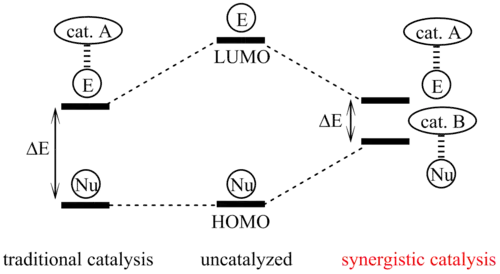 Synergistic catalysis is a specialized approach to catalysis whereby at least two different catalysts act on two different substrates simultaneously to allow reaction between the two activated materials. While a catalyst works to lower the energy of reaction overall, a reaction using synergistic catalysts work together to increase the energy level of HOMO of one of the molecules and lower the LUMO of another.[1] While this concept has come to be important in developing synthetic pathways, this strategy is commonly found in biological systems as well.