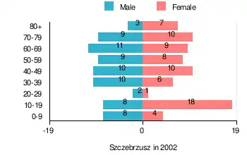 According to the 2002 Poland census, there were 143 people residing in Szczebrzusz village, of whom 49% were male and 51% were female. In the village, the population was spread out, with 21% under the age of 18, 28% from 18 to 44, 21% from 45 to 64, and 30.1% who were 65 years of age or older.[1]