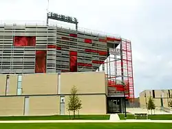 DLR Group and Page, formerly known as PageSoutherlandPage,[35] jointly designed the stadium to match the adjacent buildings including the new stadium parking garage that had been constructed earlier during the year, but also wanted a unique architectural design for the project.[36] The stadium was designed with a "corrugated metal exterior skin" that allows for optimal air flow and natural lighting.[36] A sun shade study was conducted to determine the best orientation for the new stadium. As a result, unlike the previous stadium, the orientation of the new stadium was designed to be in an "East-West" configuration to provide for greater comfort for fans and athletes. Simultaneously, the orientation allows for a maximized view of the Houston skyline.[36] The stadium site, at its on-campus location, is less than three miles from Downtown Houston.