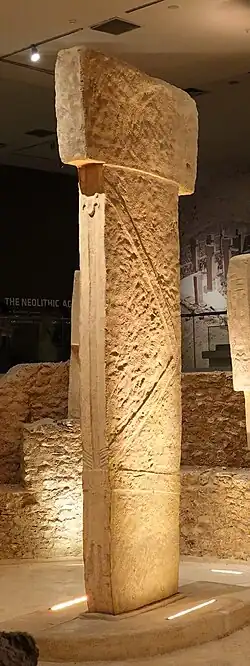 The T-shaped pillar tradition seen at Göbekli Tepe is unique to the Urfa region but is found at most PPN sites.[14] These include Nevalı Çori, Hamzan Tepe,[15] Karahan Tepe,[16] Harbetsuvan Tepesi,[17] Sefer Tepe,[14] and Taslı Tepe.[18] Other stone stelae—without the characteristic T shape—have been documented at contemporary sites further afield, including Çayönü, Qermez Dere, Boncuklu Tarla and Gusir Höyük.[19]