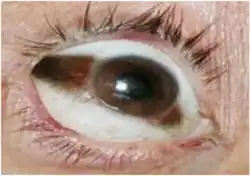 Tache noire de la sclerotique (French for Black spot of the sclera) is one of the ocular signs of death in which a reddish-brown discoloration is transversely arranged across the sclera. It occurs when the eyes are not completely closed so that the sclera is exposed to air.[1] If the eyelids are open for a few hours after death, a film of cell debris and mucus forms two yellow triangles on the sclera, each at side of the iris, with base towards the margin of cornea and apex towards medial or lateral canthus of the eye, which becomes brown and then black within a few hours, upon which dust settles and the surface becomes wrinkled.[2]
