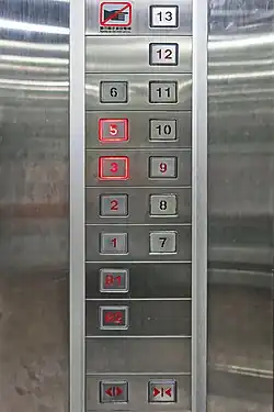 An elevator in Taiwan that is missing a button for the fourth floor of a building.