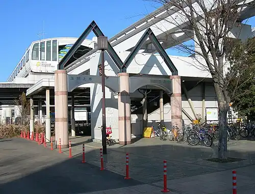 Tamagawa-Jōsui Station (玉川上水駅, Tamagawa Jōsui-eki) is a passenger railway station located in the city of Tachikawa, Tokyo, Japan, operated by the private railway operator Seibu Railway, and a monorail station operated by the Tokyo Tama Intercity Monorail in Higashiyamato, Tokyo, Japan. The two stations are adjacent to, and at right angles to one another, with the border between the two cities passing in between the stations. The names of the stations are identical in Japanese, but are transliterated slightly different in romaji such that the Seibu Station is Tamagawa-Jōsui Station, whereas the Tokyo Tama Intercity Monorail is Tamagawajosui Station (i.e. without the hypen or diacritic mark).