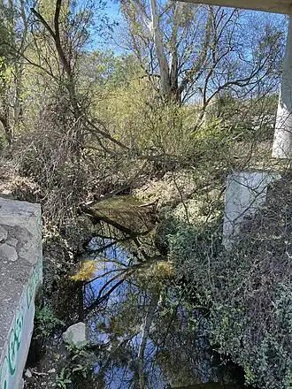 Upper Tar Creek flows southeast out of Wildcat Canyon,[5] then flows south over Castro Valley[6] where it is bisected by Castro Valley Road. From there, the creek flows south then west through the Sargent Ranch towards U.S. Highway 101 where it crosses beneath the freeway in a large viaduct shared with the Union Pacific Railroad.