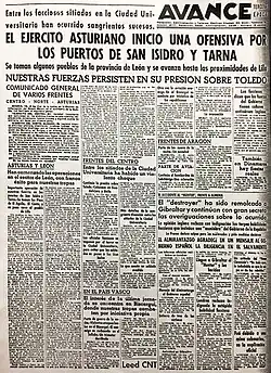 - ^ De Blas, Juan Antonio (1986). "Se fijan los frentes" La Guerra Civil en Asturias, Crónica general de España. Gijón: Ediciones Júcar. p. 257.