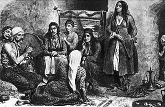 There are three main subgroups of the Crimean Roma — the Krimurja, the Urmacheli, and the Tayfa.[9] There are also subgroups of within each of the Crimean Roma communities: however, the castes of some subgroups were somewhat fluid in that people who switched professions and assimilated into the caste of said profession would be considered part of the caste,[6] and there was some mixing between different Crimean Roma groups, namely the Krimurja and the Tayfa.[10] Crimean Roma are often called Chingene by non-Roma Crimean Tatars.[11] Due to the fact that the different Crimean Roma all professed the Muslim faith and imitated Crimean Tatars in customs and dress, it was often difficult for the Russian population to tell about the Roma and non-Roma Crimeans at first glance.[9]