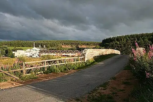 Nothing now remains of the station, signal box or siding however the entrance and car park area is still present and the line remains open.[7] The distillery branch was operated by a signal box located near the road overbridge on its western side with two short sidings and associated points lying parallel to the main line. The single track branch to the distillery had sidings that supplied the loading dock area.[3]