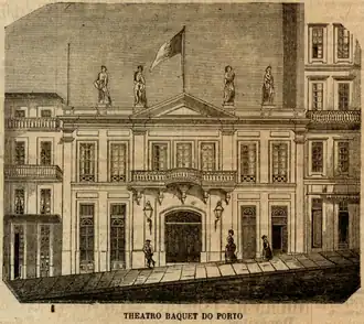 The theatre was built in the same street as the Teatro Circo, which became the Teatro do Príncipe Real and is now the Teatro Sá da Bandeira, the oldest theatre in Porto. Some construction difficulties were experienced because the street was much higher than the plot of land owned by Baquet, with the result that the theatre was higher at the back than the front. As a consequence, spectators seated in the stalls had to walk down two ramps to get to their places.[1][2]