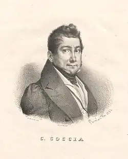 On 13 April 1873, in Novara, Carlo Coccia, who had been for more than thirty years master of the Cappella del Capitolo del Duomo (which boasts an important tradition of opera masters, such as Pietro Generali, Saverio Mercadante and Antonio Cagnoni), as well as director of the Civic Institute of Music "Brera", died. As mentioned, the Teatro Nuovo, which for some time had required its own name, to worthily honour the distinguished musician, took the latter's name on 6 July of the same year. The contract of 9 March 1886, was entrusted to the Milanese architect Giuseppe Oliverio to the detriment of the too expensive project developed by Andrea Scala.[3][2]