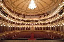 Back in the day, Novara did not have a permanent theatre, and operas took place in private venues, such as noblemen's rooms and courts. The preferred venue was Casa Petazzi, equipped with a gallery and boxes. Count Luigi Maria Torinelli, together with the newly formed Società dei Palchettisti (English: Society of Box Holders), provided the funds for a new theatre. The new theater was called Teatro Civico, also known as Teatro Nuovo. Construction works started in 1777. The opera house was completed in two years, being inaugurated in 1779 (with Medonte re d'Epiro by Giuseppe Sarti) on a project of Cosimo Morelli.[1][2] The Galliari brothers completed the decorations on the interior, as well as the stage curtain. On the latter, they depicted Hercules, the mythological founder of the city. The boxes were covered in blue silk, and they held carved seats in rich brocade. Luigi Canonica restructured the Civico/Nuovo in 1830. Between 1853 and 1855 the Teatro Sociale, a second theatre, opened in Novara. A fierce competition between the Teatro Sociale, hosting minor companies and promoting young talents, and the Teatro Civico/Nuovo, later renamed Teatro Antico, ensued. When Carlo Coccia died in 1873, the Antico's name was changed again, in Teatro Coccia.[1][3]