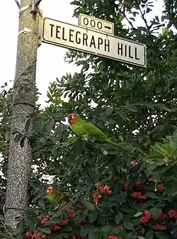 Telegraph Hill is known for supporting a flock of feral parrots, a mix of red-masked parakeets (Psittacara erythrogenys) and mitred parakeets (Psittacara mitratus),[22][23] descended from escaped or released pets. The birds, known in the bird trade as cherry-headed conures, are native to Peru and Ecuador. They have established a breeding colony with the support of some residents, and through the help of volunteers with Mickaboo Companion Bird Rescue.[24]