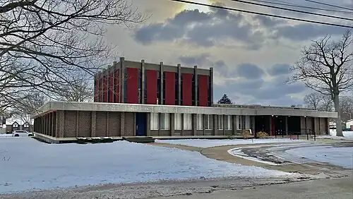 By 1965 the congregation had approximately 175 families, and had outgrown its building on Cedar Avenue, which had inadequate facilities, and too few (and unsafe) classrooms.[19] In 1961 Beth Israel had acquired from the New York Power Authority 2 acres (8,100 m2) of land at College Avenue and Madison Avenue, valued at approximately $100,000, in exchange for 1-acre (4,000 m2) of land the Authority needed in Beth Israel's cemetery.[19] Funds were raised for a new building,[20] and in 1966 construction began on facilities on College Avenue. The work was completed in time for High Holiday services to be held there in 1967.[3][1][2]
