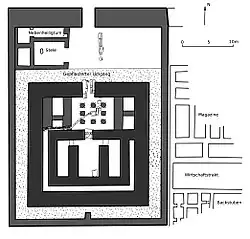 The entrance was on the north side, where the walls were stronger and it seems that they formed a brick pylon. The entrance was at one time perhaps framed by inscribed limestone slabs.[5] The proper temple stood within an open courtyard. On the west side behind the main gate there was small temple, while the main one was opposite the north entrance. Behind the entrance of the temple proper stood a courtyard with perhaps eight columns. Some stone column bases were still found. East and west of this courtyard were on either side two smaller chambers, while on the south side were three cult chapels. This temple was placed within a larger complex. On the east side were excavated remains of storage and administrative buildings.