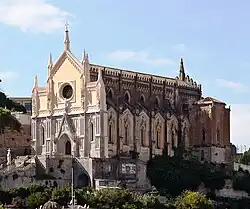 The project was entrusted to Giacomo Guarinelli, a major and commander of the Engineer Corps, as well as an architect.[20] He did not demolish the old church, but preserved its Gothic structure by enlarging and cladding it, both internally and externally, with a rich neo-Gothic decorative scheme, and by making some changes to the spaces from their original state (e.g. by transforming the chapels into aisles).[4] Work lasted from April 1850 to 1858; it was interrupted at the time of the siege of the city (1860), only to be finished under the direction of Francesco Del Vecchio (who took over from Guarinelli in 1870 and remained faithful to his predecessor's project) in 1874 at the expense of the Italian government, which had already financed a restoration in 1864 after the minor damage caused during the siege.[20] However, the structure remained unfinished in the bell tower: it was intended to be built on the right side of the church, to be divided into four orders (construction stopped at the first) and to end with a tall spire, the top of which would have been placed about 62 meters from the base.[22] The dedication, scheduled for October 4, 1885,[23] did not take place until October 9, 1927.[24]