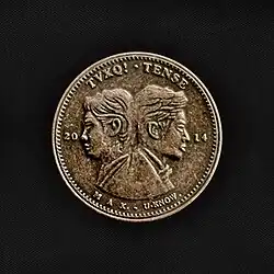 On December 26, 2013, the day of TVXQ's tenth debut anniversary, a sixteen-second teaser trailer for the music video of "Something", the album's first lead single, began airing on television and other broadcast media around South Korea.[25] Through the trailers, it was announced that Tense would be released on January 6, 2014. Their official Korean website was also uploaded with an image of the album's digital cover, which was a picture of a golden coin engraved with the silhouettes of the duo. The image also included a message that thanked the fans for walking together with TVXQ in the past ten years.[26]