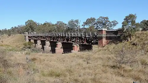 The single 4 ft 8+12 in (1,435 mm) standard gauge railway bridge is located 784.233 kilometres (487.300 mi) from Central Sydney railway station or 12 kilometres (7.5 mi) north of Tenterfield. The six-span timber truss viaduct bridge has a 12-metre (40 ft) span centre to centre of timber trestles. The Queen post trusses are deck Queen post copied from one of I. K. Brunel's Cornish timber bridges, the one called St Germans viaduct, built about 30 years earlier.[1]
