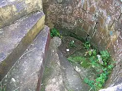 The small, irregular, octangular 14th-century vaulted tower has a splayed base[4][5] and is constructed of courses of square ashlar masonry,[6] 6 m (20 ft) high, with walls 2 metres (6.6 ft) thick, is the earliest part of the structure, together with the wide wall at the north-west. The tower was vaulted, with three ribs, and an entrance from the courtyard via a narrow passage leading to a partly surviving wheel-stair.[4] The remains of outbuildings lie to the north and a well was recorded within the keep; a sizeable courtyard lay within the complex.[7] The remains have seen some restoration[8] and the lines of excavation trenches are apparent. The whereabouts of the records of the late 19th-century excavations is not known for certain.[9]