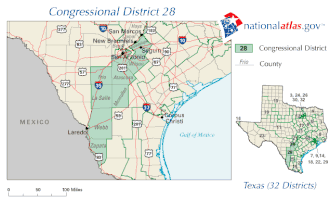 Texas's 28th congressional district of the United States House of Representatives covers a strip in deep south Texas starting in the eastern outskirts of San Antonio, and ending at the U.S.–Mexico border. Towns entirely or partially within this district include Converse, Laredo, Rio Grande City, and Universal City. TX-28 includes The Alamo, a historic monument in what is now downtown San Antonio that plays a central role in Texas' identity. The current Representative from the 28th district is Henry Cuellar.