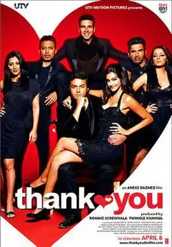 Thank You is a 2011 Indian Hindi-language romantic comedy film written and directed by Anees Bazmee and produced jointly by Ronnie Screwvala and Twinkle Khanna under UTV Motion Pictures.[3][4][5] The film stars Akshay Kumar, Bobby Deol, Suniel Shetty, Irrfan Khan, Sonam Kapoor, Rimi Sen and Celina Jaitly. Ranjeet, Mukesh Tiwari, Rakhee Tandon, Smita Jaykar, and Chahat Khanna are featured in supporting roles with Mallika Sherawat and Vidya Balan in special appearances.
