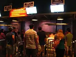 The ride vehicles, co-developed by Oceaneering International, are mounted to a track-roaming platform that provides the forward motion to move the vehicle through each show scene.[20][23] The yaw motor and attached stewart platform allow them to move 360 degrees at different angles along the track.[24] The track switches were manufactured by Dynamic Structures.[25] Each of the vehicles designed by Thierry Coup are themed as the Daily Bugle's new "Scoop" vehicle for reporters, with each accommodating 12 riders.[26] Each row of four riders is restrained by a single lap bar.[5] The system was invented by Universal Creative employees Philip Hettema, William Mason, and Gary Goddard.[27] A similar system has been patented by Oceaneering International and used on rides such as The Curse of DarKastle at Busch Gardens Williamsburg, Tokyo Panic Cruise at Tokyo Dome, and Speed of Magic at Ferrari World Abu Dhabi.[28][29][30]