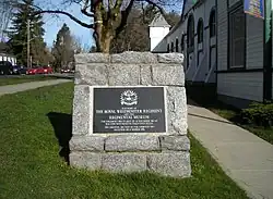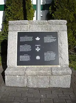 Two stone cairns were erected on 6th Street in front of The Armouries dedicated with a copper plaque. The monument next to the 6th Street doors is to the memory of the Regiment's Victoria Cross recipients, Major John Keefer Mahony and Acting Corporal Filip Konowal.[6] The monument on the corner of Queens and 6th is dedicated to The Royal Westminster Regiment. The copper plaques were stolen from the cairns by metal thieves and were eventually replaced with marble carvings.[2]
