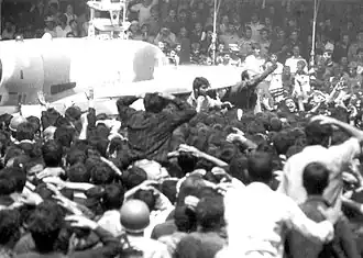 The Ayatollah celebration came into use at the Cardiff City games in 1990. It was originally performed by the singers and fans of a Welsh-language punk group called U Thant. It was first performed by the Cardiff City fans at the Sincil Bank, home of Lincoln City, on 15 September 1990, the day after U Thant had played a gig at Cardiff's Chapter Arts Centre.[3] U Thant's singer had been inspired by footage of attendants at the funeral of Ayatollah Khomeini, which was broadcast live on British TV, doing the movement to express their grief at his death.[4]
