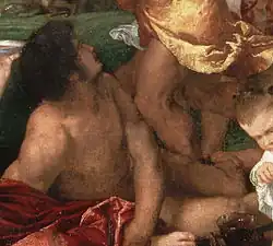 In 1598, control of Ferrara passed to the Papal State and the Este family had to withdraw to Modena. During the transfer, cardinal and papal legate Pietro Aldobrandini appropriated many paintings, among which were The Bacchanal and The Worship of Venus.[2] Aldobrandini never exhibited the taken paintings. His theft only became known in 1629 after the paintings had come into the Ludovisi inheritance and then were sold to the Duke of Monterrey in payment of the Principality of Piombino. They were then donated to Philip IV of Spain in 1639.[3] The first documentation of the paintings in Spain date to the inventories of the Royal Alcázar of Madrid in 1666, 1686, and 1700.[4]