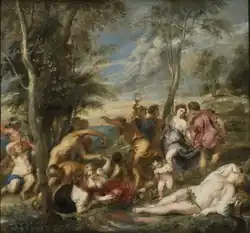 The three canvases of Titian were admired and copied as much in Italy as in Spain by artists like Pieter Paul Rubens, Guido Reni, Nicolas Poussin, and Diego Velázquez, and they contributed to the development of the Baroque style. Rubens' copies of The Bacchanal are housed at the Nationalmuseum in Stockholm.[1] The Italian artist Domenichino famously wept upon hearing that the masterpieces had left Italy.[5]: 70