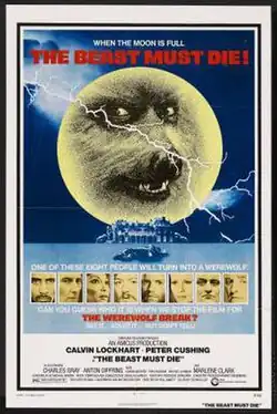 The Beast Must Die is a 1974 British horror film directed by Paul Annett. The screenplay was written by Michael Winder, based on the 1950 short story "There Shall Be No Darkness" by James Blish, originally published in Thrilling Wonder Stories. The film stars Calvin Lockhart, Peter Cushing, Marlene Clark, Charles Gray, Anton Diffring, Ciaran Madden, Tom Chadbon, and Michael Gambon.[2][3] The plot involves a millionaire big game hunter who gathers six people at his remote English mansion, announcing that he suspects one of them is a werewolf. The viewer is invited to unfold the mystery along with the characters.