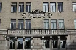 At the 10th and 11th stories, each elevation contains several double-height window groupings, each three bays wide and surrounded by terracotta frames.[38] In each grouping, the 10th-story windows contain false balustrades, while the spandrel panels between the 10th and 11th stories contain a cartouche, winged cherubs, and brackets. In the center bay of each grouping, there is a rosette above the 11th story.[39] At the 14th and 15th stories, there are more double-height window groupings, each three bays wide. Each grouping is flanked by brick pilasters and is topped by a triangular broken pediment surrounding a central grille.[38] There are rosettes on the spandrels between the 14th and 15th stories. The center bay of each grouping contains a projecting balcony at the 14th story; a curved broken pediment with a ram's head above the 14th story; and a cartouche above the 15th story.[39]