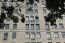 At the fourth story on Central Park West, bays 12–17[a] contain a limestone balcony, which projects from the facade and is supported by eight modillions.[39] Above the fourth story, there are four cartouches on the eastern elevation, four on the southern elevation, and two on the northern elevation.[38] Between the two inner cartouches to the east is a plaque with the inscription "Erected 1929", which is framed by swags and scrolls.[39]
