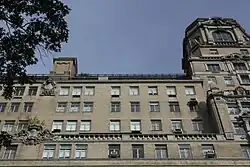 The lowest three stories of the facade are made of rusticated blocks of limestone, while the rest of the building is clad with beige brick. The facade's primary elevations face south toward 81st Street and east toward Central Park West.[25][26] This design was intended to take advantage of the building's placement next to the AMNH and Central Park.[25] The north elevation on 82nd Street is simpler in design than the primary elevations, while the west elevation is not decorated.[28] The north, south, and east elevations contain terracotta ornamentation such as pilasters, broken pediments, balustrades, obelisks, and cartouches.[25] There are also motifs such as angels, dolphins, and rams' heads.[1][35] The corners of each elevation are articulated by vertical bands of brick quoins.[25] There are horizontal band courses above the 9th, 12th, and 13th stories; each band course consists of two molded terracotta bands.[28]