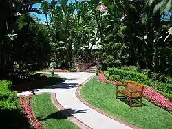 The extensive gardens, covering 12 acres (4.9 ha), were designed by landscape architect Wilbur David Cook. They contain bougainvillea, banana plants, hibiscus, and other tropical flora.[12] Svend Petersen, the Danish-American pool manager at the hotel for forty-two years, became a Hotel Ambassador in 2002.[57] He had notably opened up the pool after hours for the Beatles and taught Faye Dunaway to swim a 1940s freestyle crawl for her appearance in the film Mommie Dearest.[57]