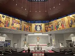 The design of the cathedral was created by the Italian designer and architect Mattia Del Prete and Cristiano Rosponi. Its shape resembles that of a tent, alluding to the "tent of meeting" or tabernacle in which the presence of God was manifested to the prophet Moses[11] as described in the Old Testament.[a][13] The cathedral has a seating capacity of 2300, with two chapels and two large rooms with cubicles for confessions. The roof of the cathedral has an octagonal dome.[14]