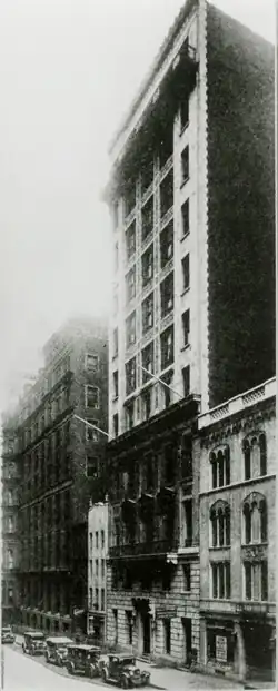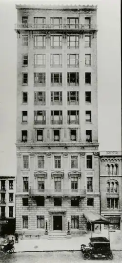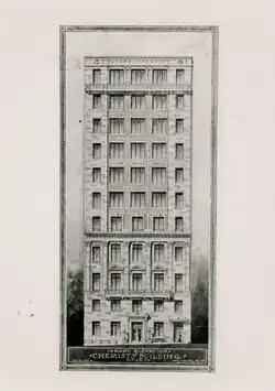 The Chemists' building at 52 East 41st Street, New York City, New York, United States was built by the architects York and Sawyer, replacing previous numbers 50-54. York and Sawyer filed the plans in January 1910[2] and completed the work in March 1911. The building opened on March 17, 1911.[1]: 6–7  Several days of events were held to celebrate the opening. A number of scientific papers were presented, ranging from "The characteristics of living matter from the physico-chemical point of view" by Jacques Loeb to "The chemistry of phosphorescence" by Wilder Dwight Bancroft and "The contributions of chemistry to sanitation" by William P. Mason.[7]: 20