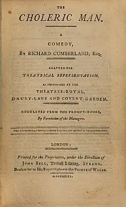 The Choleric Man is a 1774 comedy play by the British author Richard Cumberland. It premiered at the Theatre Royal, Drury Lane in London on 10 December 1774.[1] The original cast included Thomas King as Andrew Nightshade, James Aickin as Manlove, John Hayman Packer as Stapleton, Samuel Reddish as Charles Manlove, Thomas Weston as Jack Nightshade, Robert Baddeley as Dibble, John Moody as Gregory, Francis Godolphin Waldron as Frampton. Roger Wright as Frederick, Elizabeth Hopkins as Mrs Stapleton, Frances Abington as Laetitia and Jane Pope as Lucy. The play's Irish premiere took place at the Crow Street Theatre in Dublin on 14 April 1777.[2] It also appeared later at the Theatre Royal, Covent Garden.